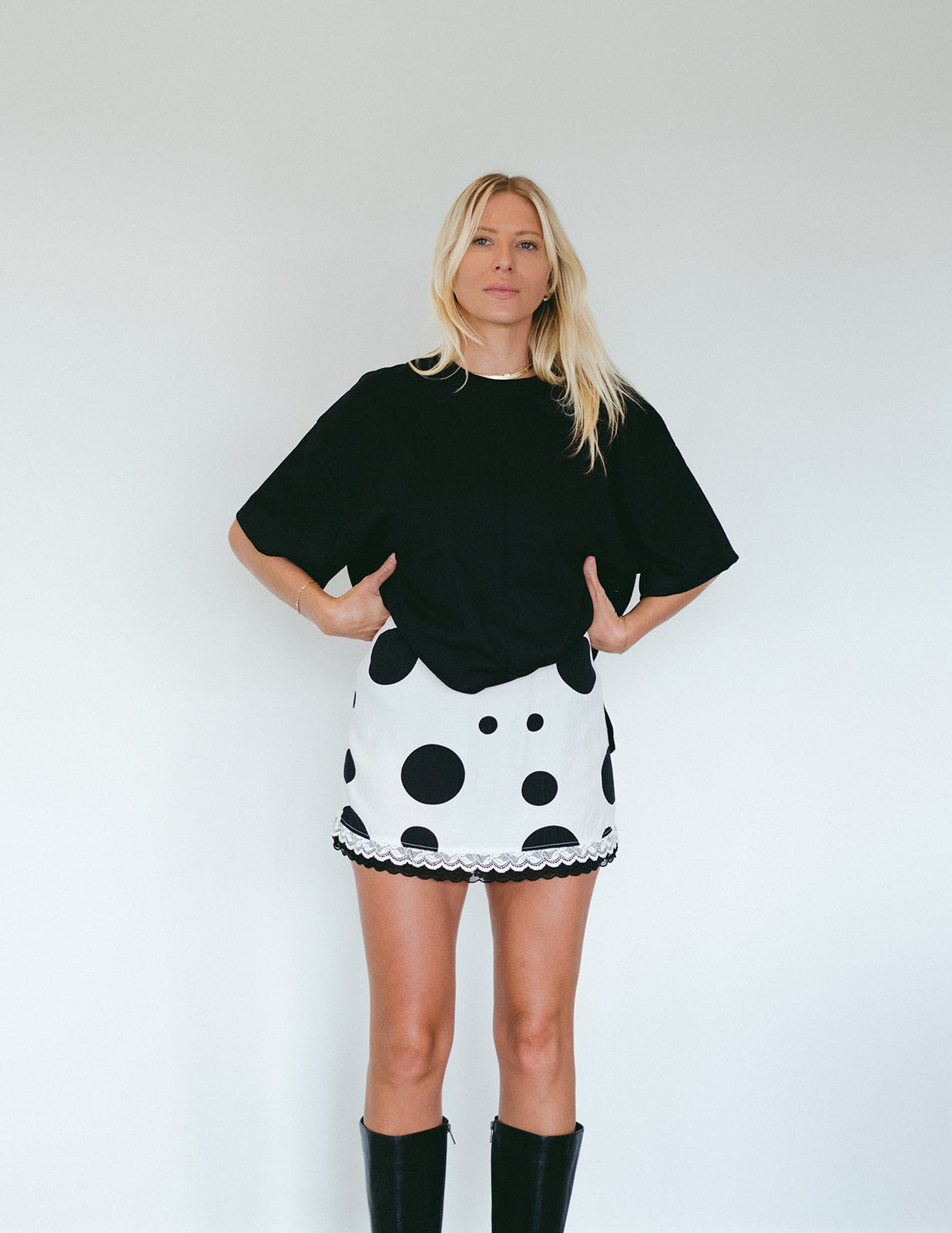 We are loving polka dots at the moment and this little number is super cute with a little detail. She has slits on both sides and black and cream lace around the hem. She can be worn from beach to bar or for a winter look with a big jacket and boots. We like to pair her with our Yasmin Tee, Elm Blouse or the perfect like bikini for a beach day.